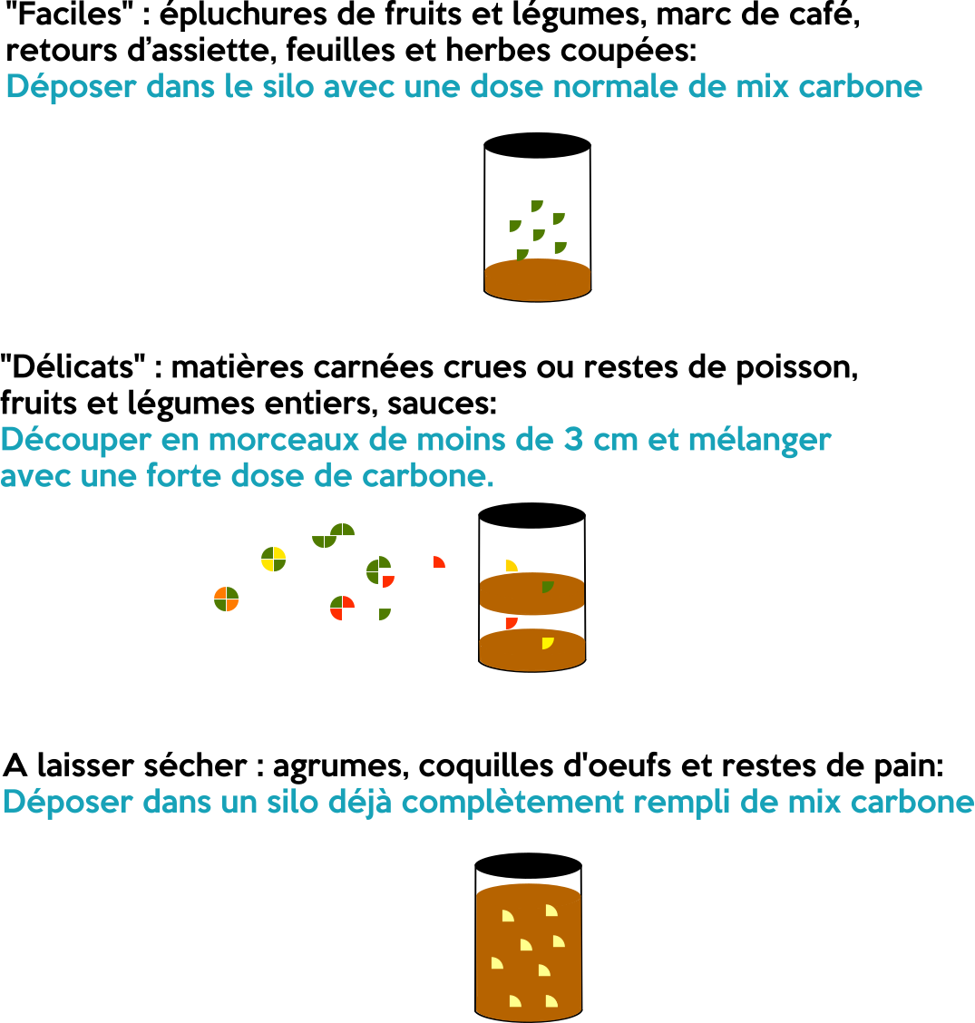 Les biodéchets suivants peuvent être mis dans les silos, mixés avec de la matière sèche fournie: